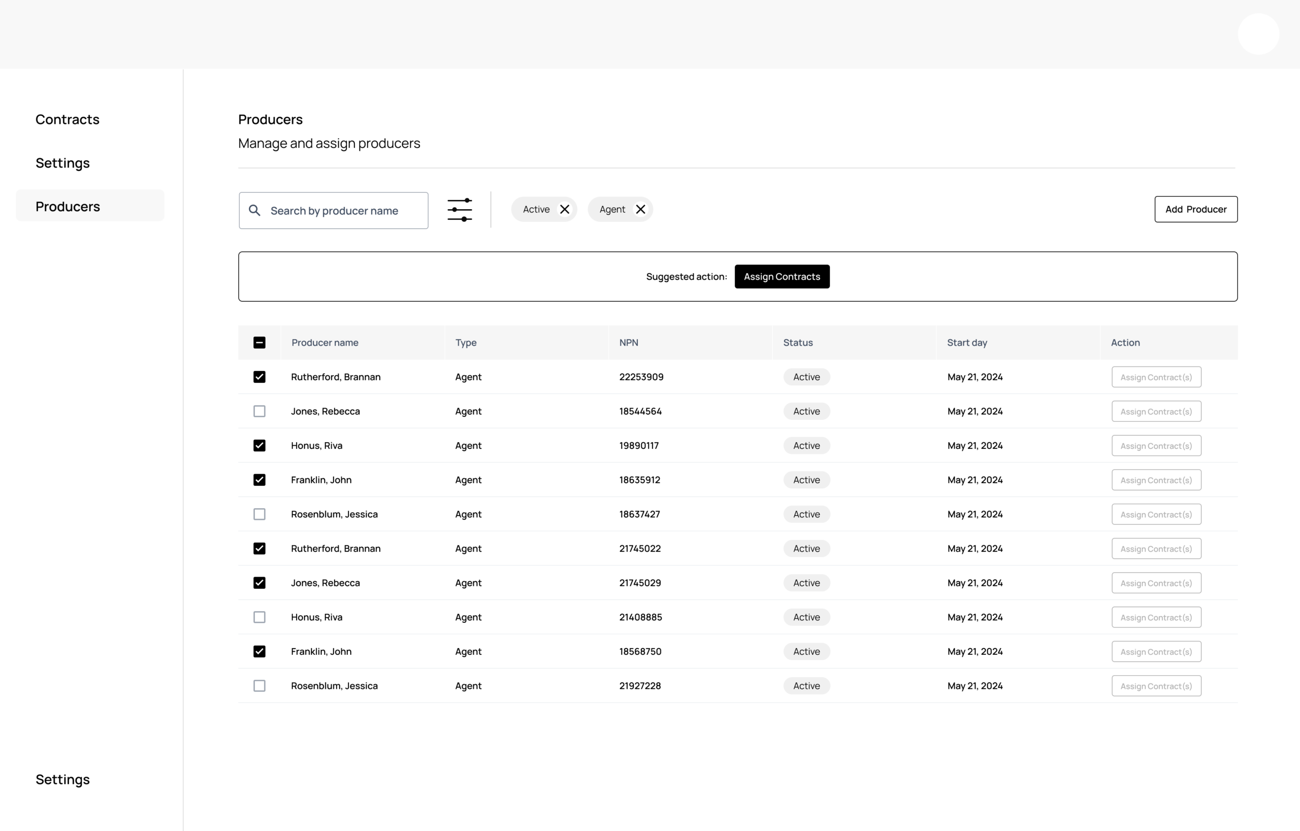 • A bulk entry point allows admins to select multiple producers and assign contracts in one action